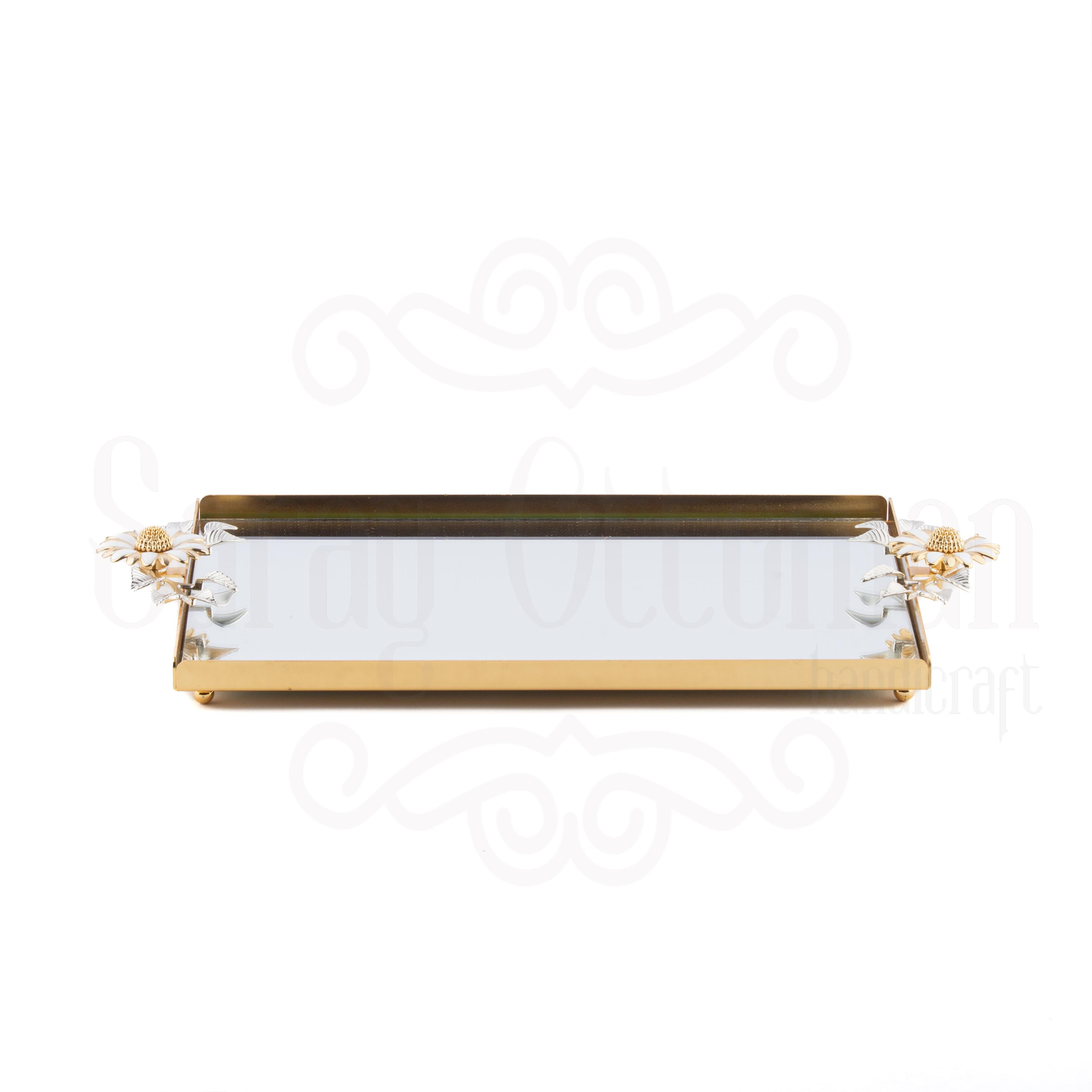Şıklığın ve zarafetin buluştuğu beyaz papatya detaylı aynalı tepsi. Özel anlarınıza şıklık katın. Söz nişan tepsisi olarak mükemmel seçenek!