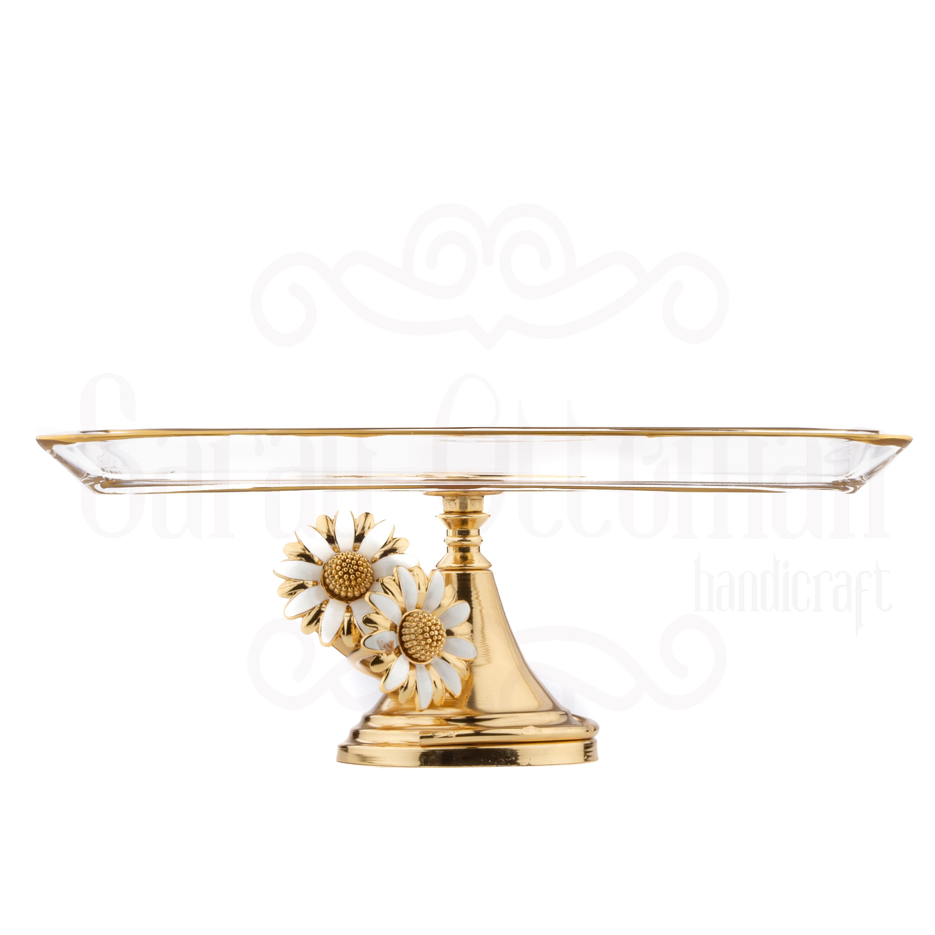Tabakta Zarafet: Cam Sunum Tabağı ile her yemek anı özel ve şık! Beyaz Papatya Sarmaşık deseni ve altın renkli detayıyla sofranıza zarafet katın.
