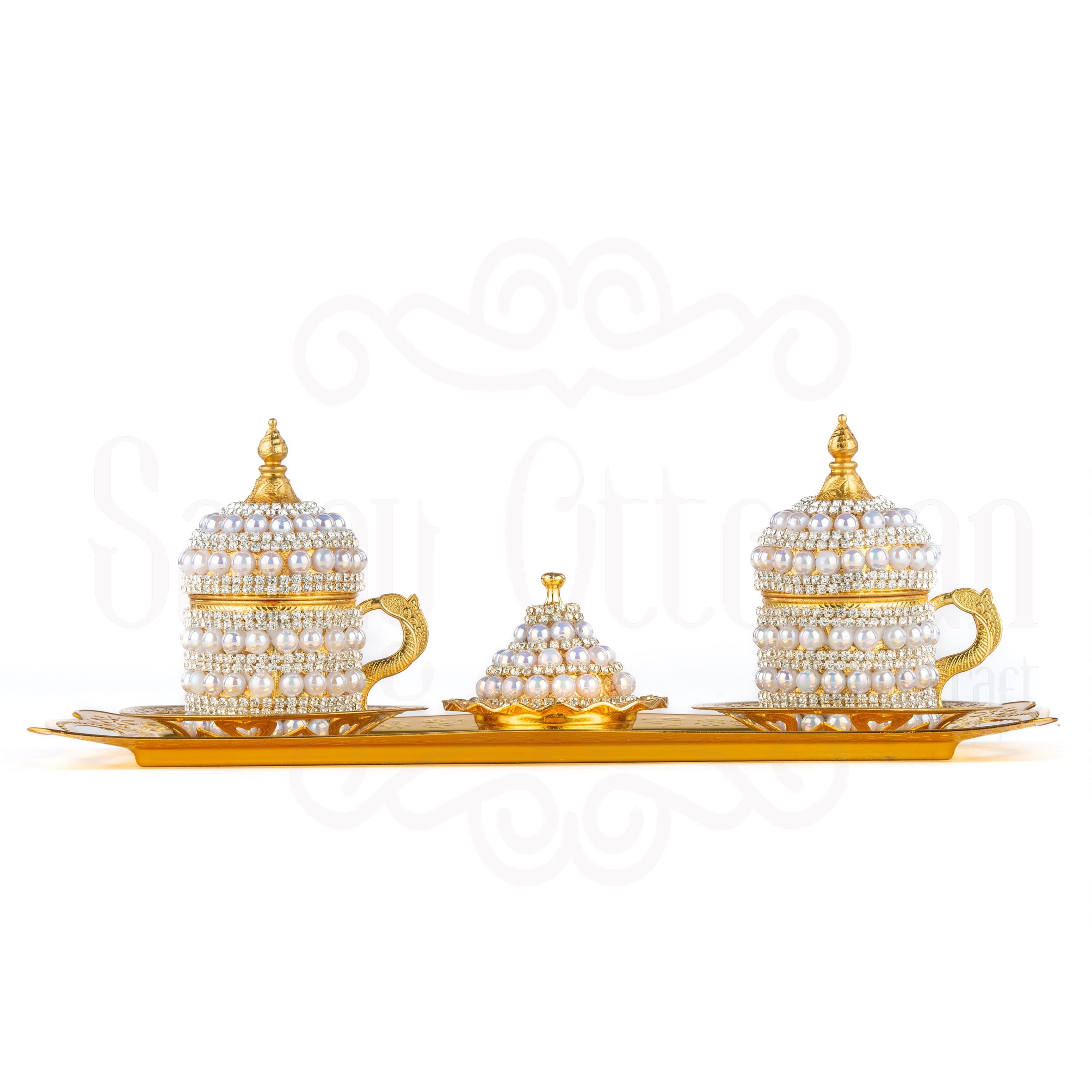 Lüks ve zarafetin tadını çıkarın! İnci ve Swarovski taşlı fincanlarla kahve deneyiminizi taçlandırın. Özel anlar için mükemmel hediye