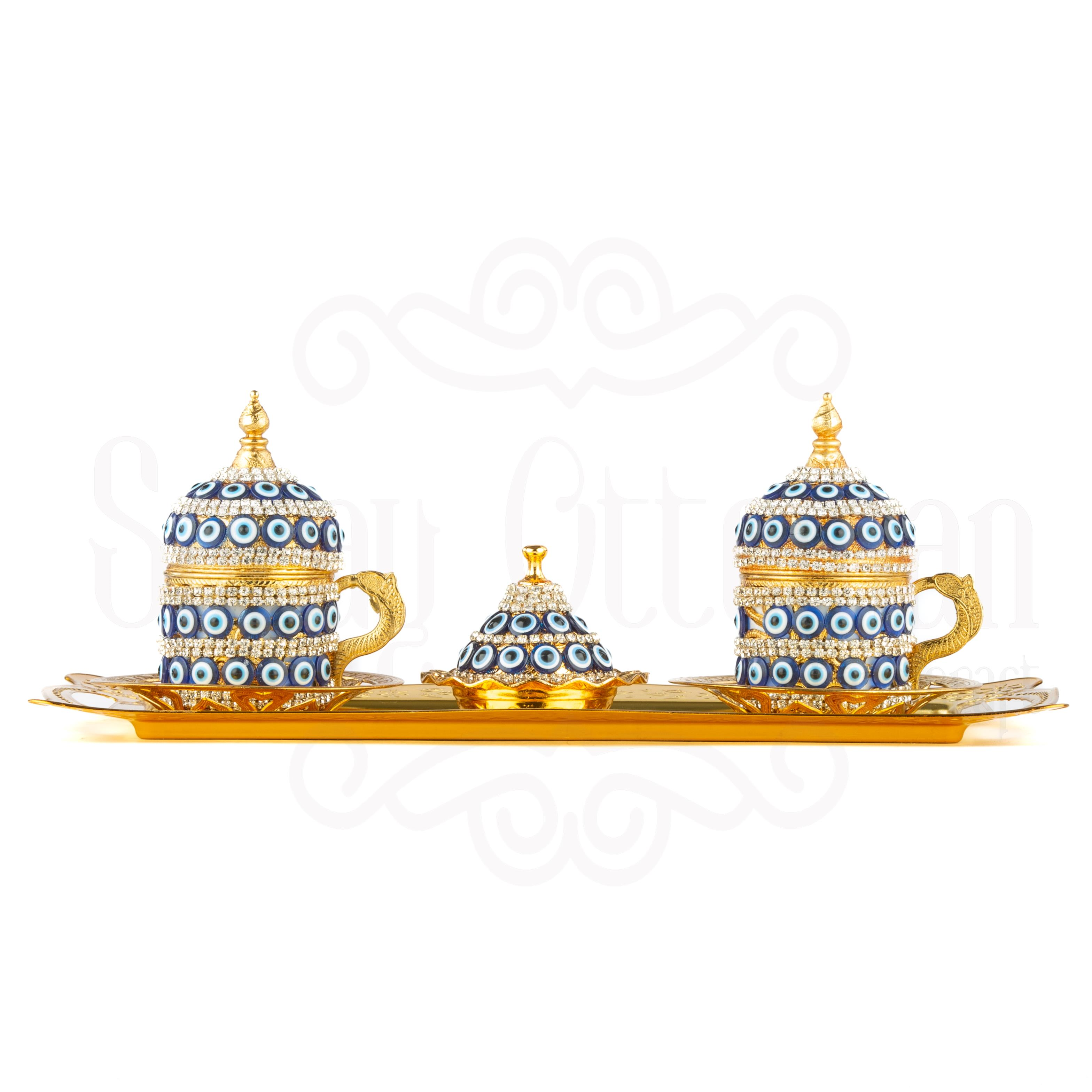 Saray Ottoman olarak size özel bir kahve deneyimi sunuyoruz! Nazar boncuğu ve Swarovski taşların büyüleyici kombinasyonu ile tasarlanmış bu muhteşem kahve fincanı takımı, her fincan kahvenizi daha özel ve şık bir anıya dönüştürecek.